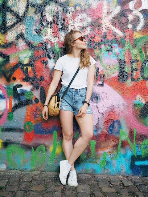 Мой первый лук для Праги был удобный и простой, белая футболка, шорты и кеды, а вечером я надела пиджак.